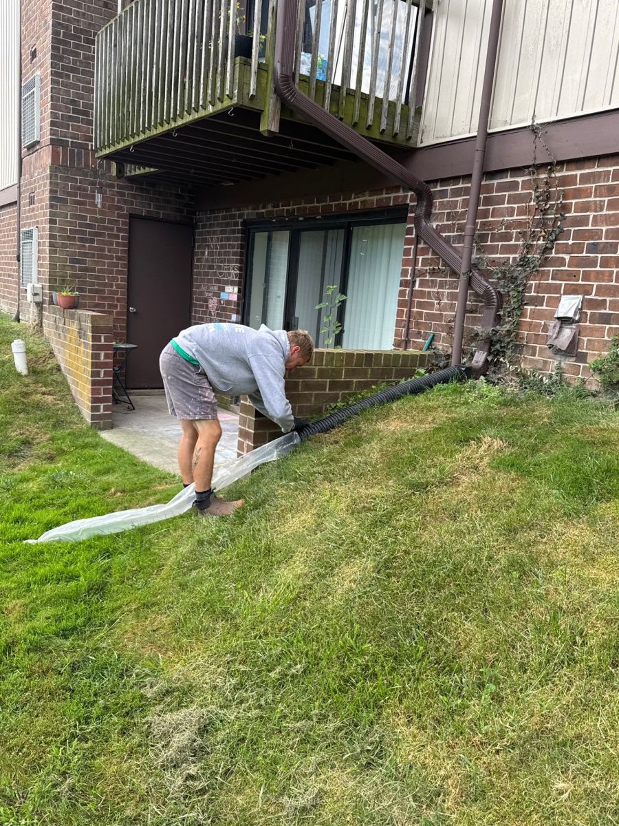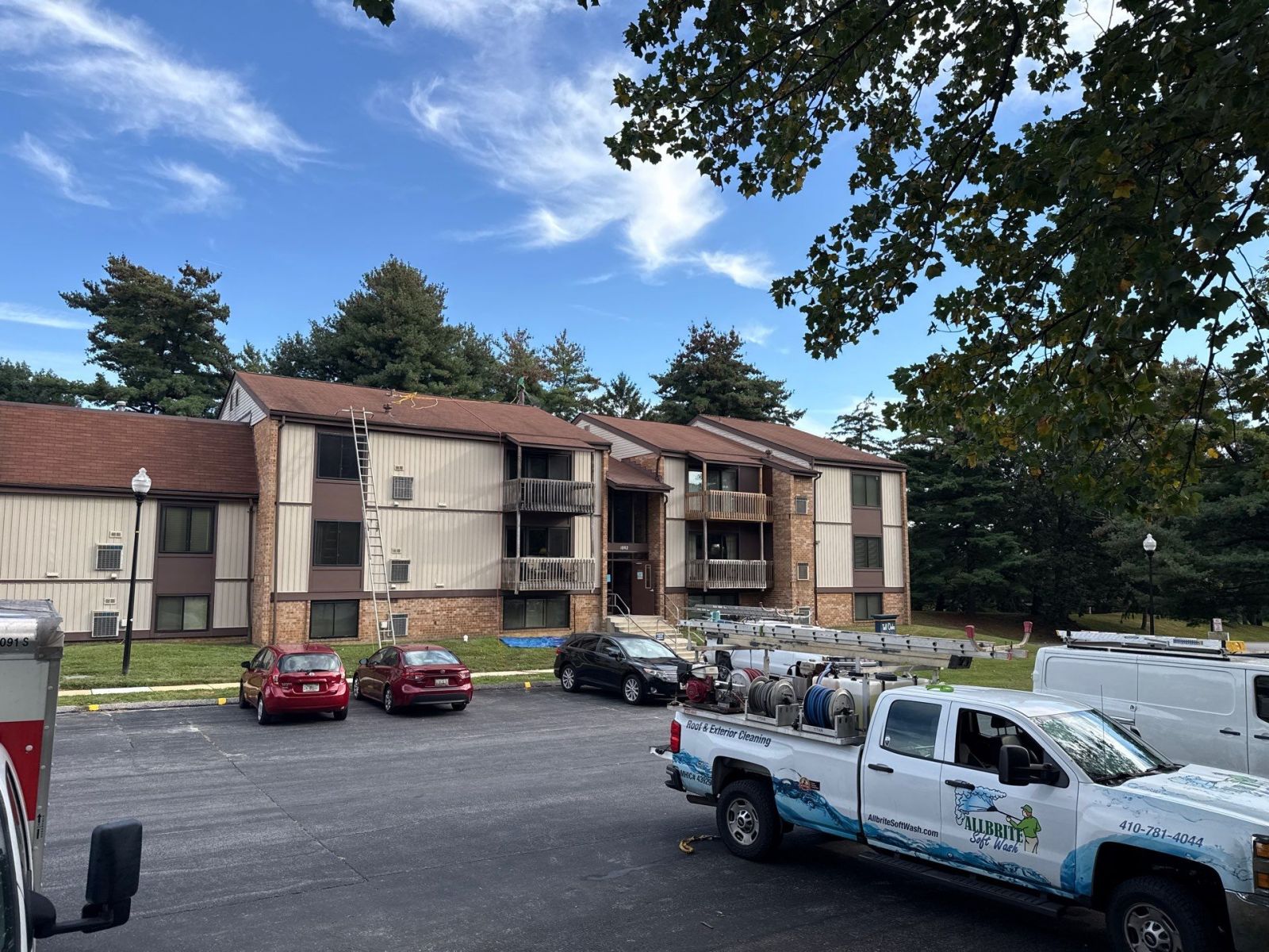 Professional roof cleaning crew setting up safety equipment at a large apartment complex