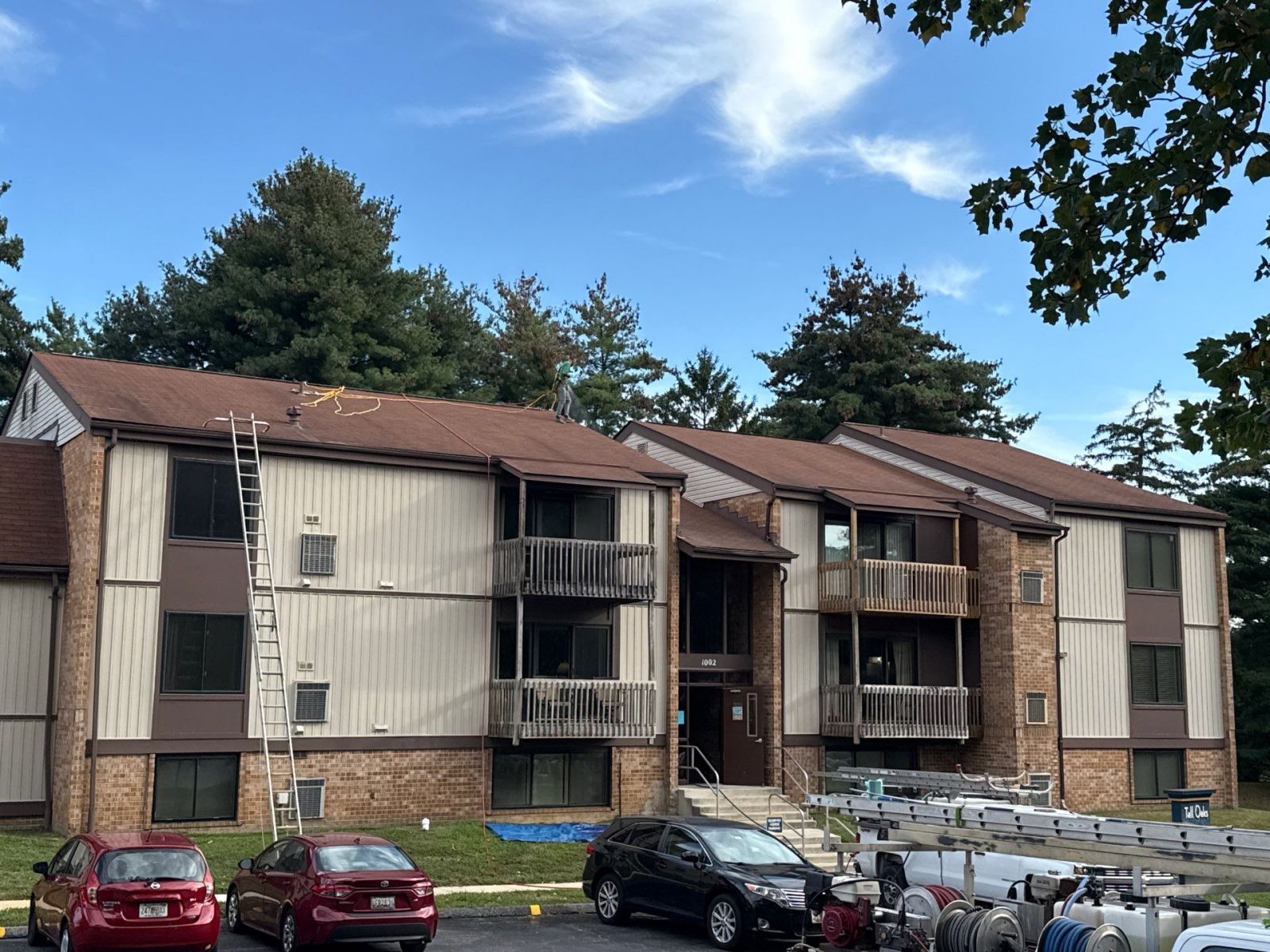 Workers cleaning a multi-unit apartment complex roof using professional equipment